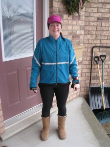 notes: I felt fantastic for the first 9M and then the edges started to fray. given the week I’ve had, the pain was a good thing. just needed to know that I was still alive, could still feel pain and that running still makes me happy. all the stablizing muscles for my L ankle are sore and were still sore monday night when I ran again. so some cramping in that leg and minor overall discomfort. it hurt more at the time but now looking back on it all it’s started to fade and I’m jonesing for another run!the weather started out grey but deteriorated to rain over the course of the run. by the time I got home I was soaked through and frozen solid! much colder than I’d ever been on our -15 runs!note the boots in this picture – I was so cold I couldn’t keep my shoes on any longer and grabbed these… I swear this type of boot is the ugliest type of boot ever, but man those suckers are warm! (side note: my lips were as blue as my coat… picture just does not capture the full extent of my frigidness)before the run, I ate one of my protein bars (see: my post about my protein bars here > http://www.irun.ca/blog/index.php/bad-running-week-and-weekend/) and a whole grain bagel with pb and honey. no stomach/bathroom issues on the run and with all those complex carbs, I had lots of energy. on the run I ate a Carb Boom gel (cherry chocolate flavour) and water.ran a really great course which incorporated part of my marathon course – egads! that’s only 6 weeks away! got to see lots of the Grand River and run up and down lots of small-ish hills.